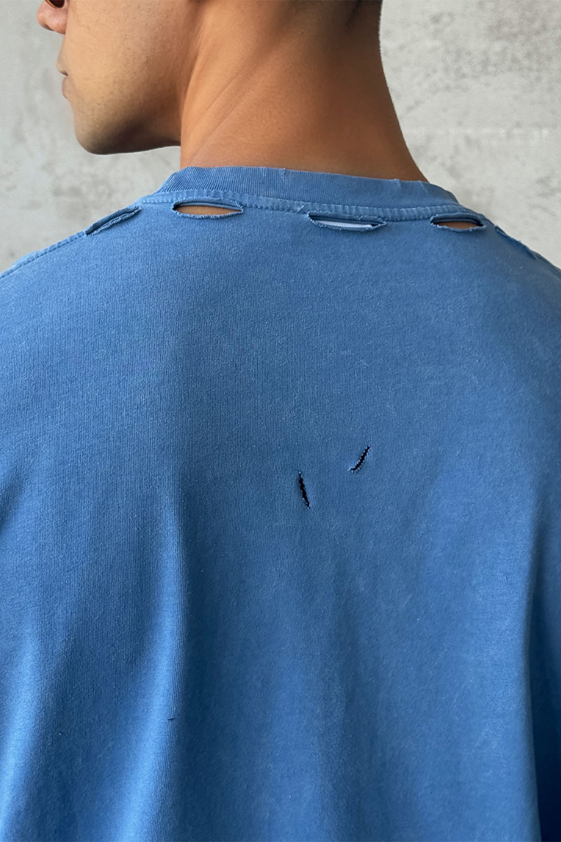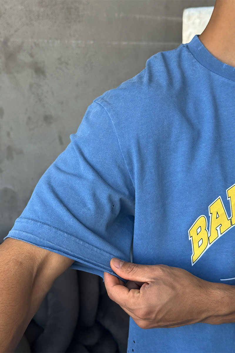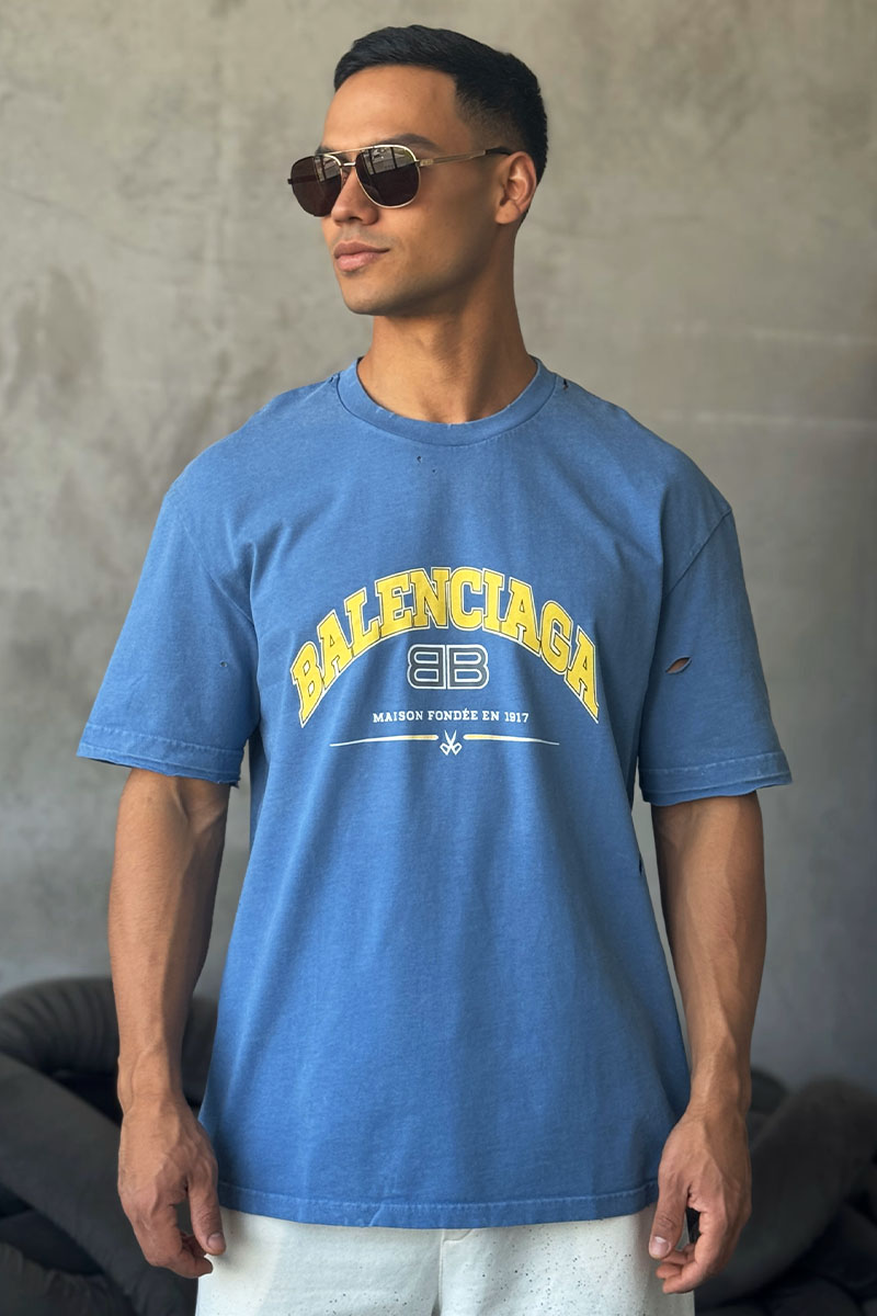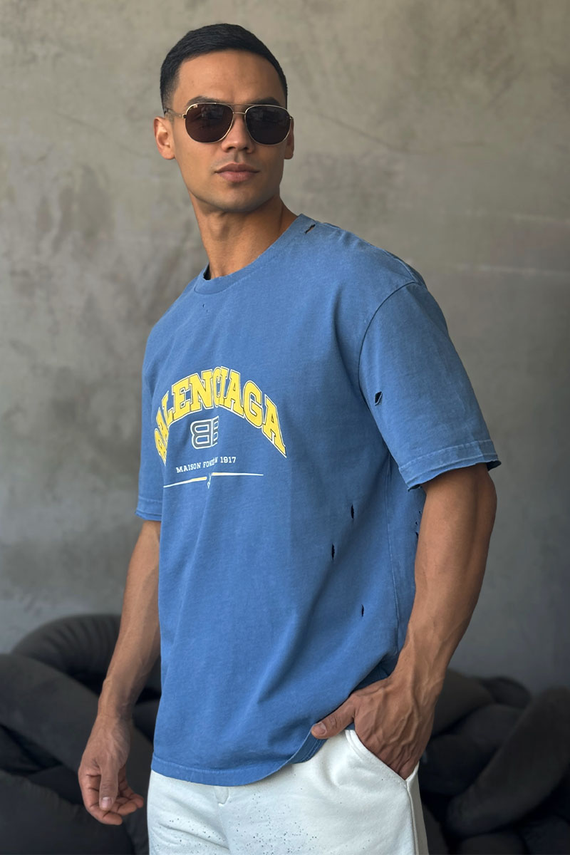 Синяя оверсайз футболка Balenciaga с рваной отделкой