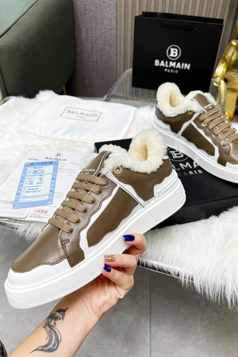 Кожаные кроссовки с мехом Balmain low-top - Beige / White