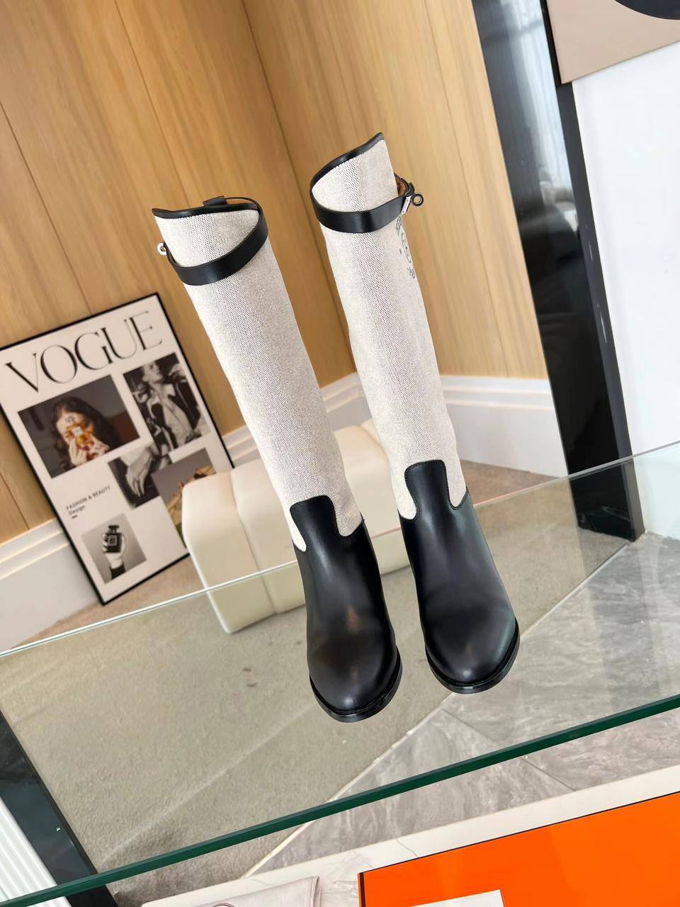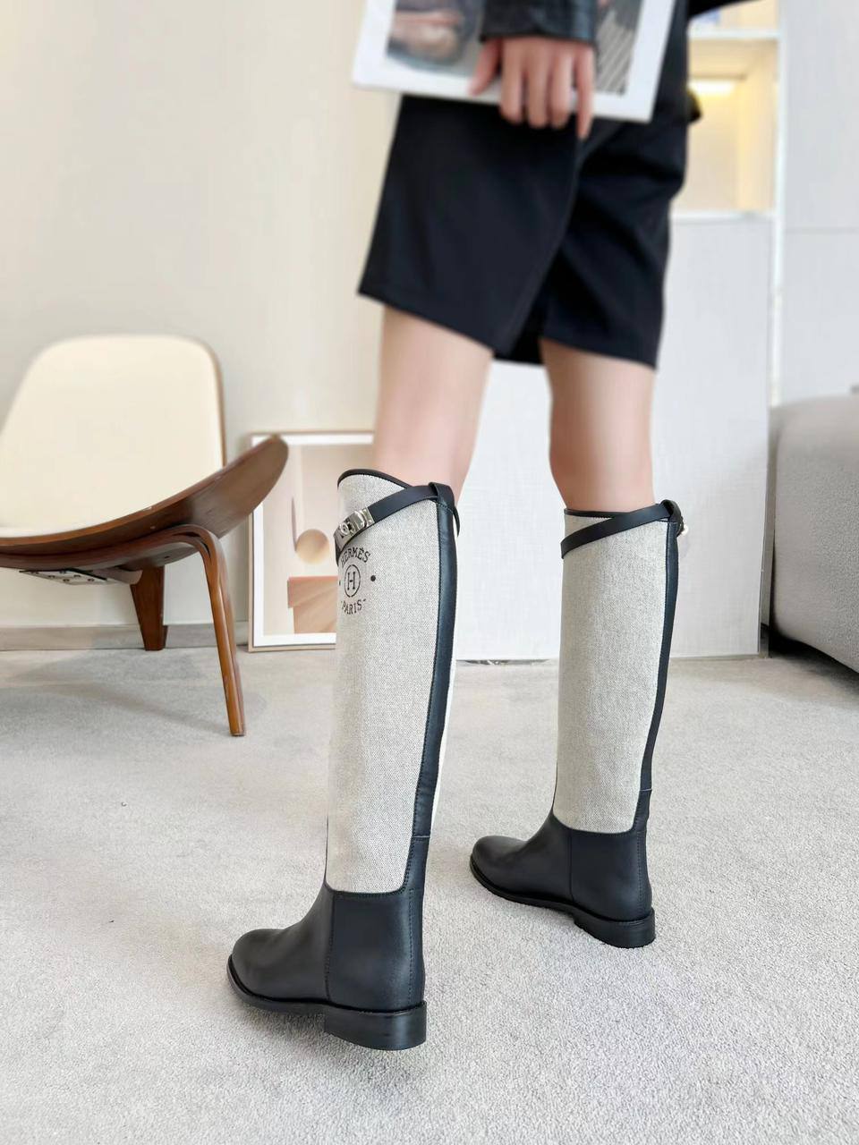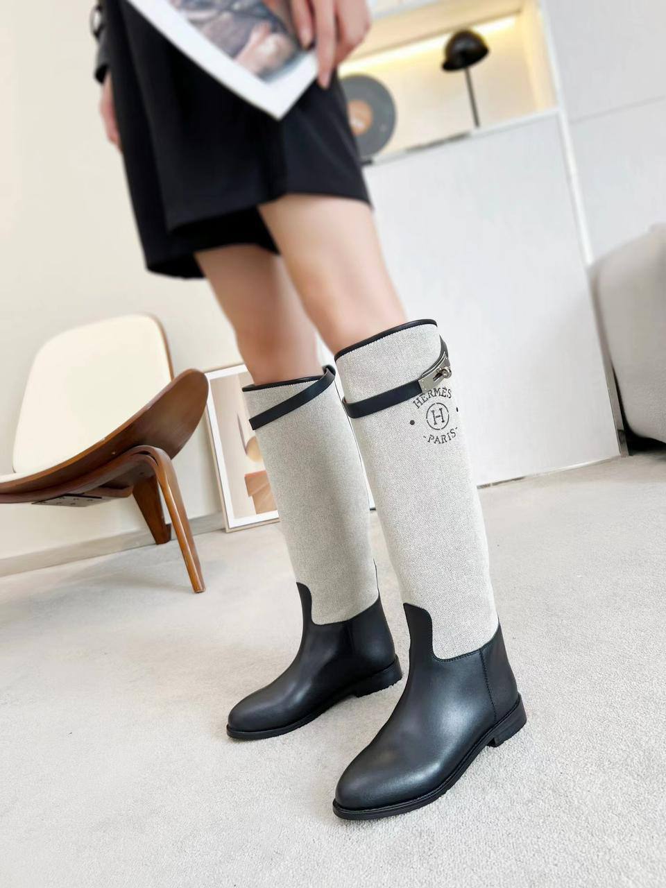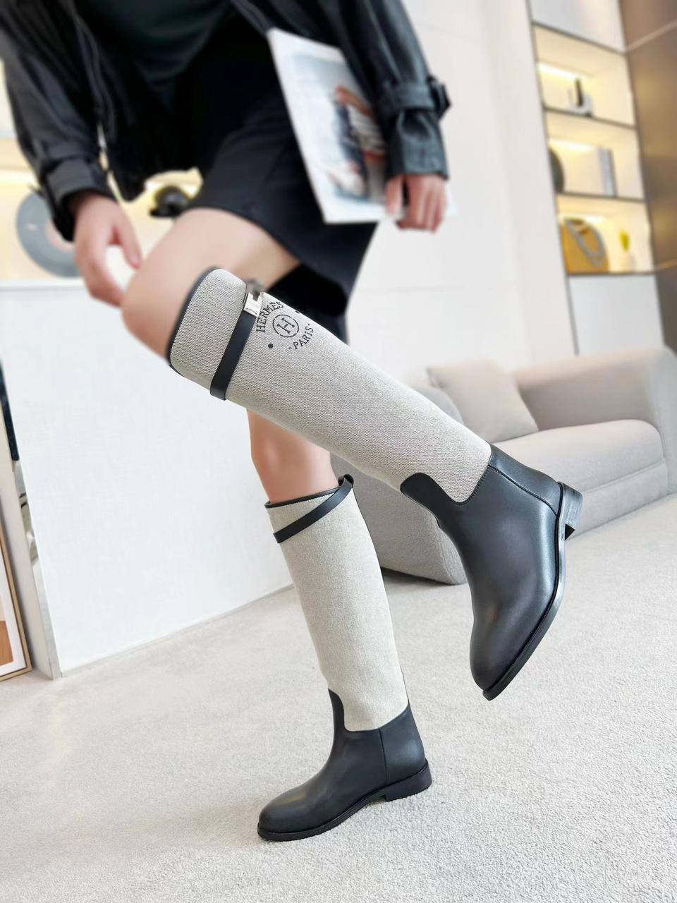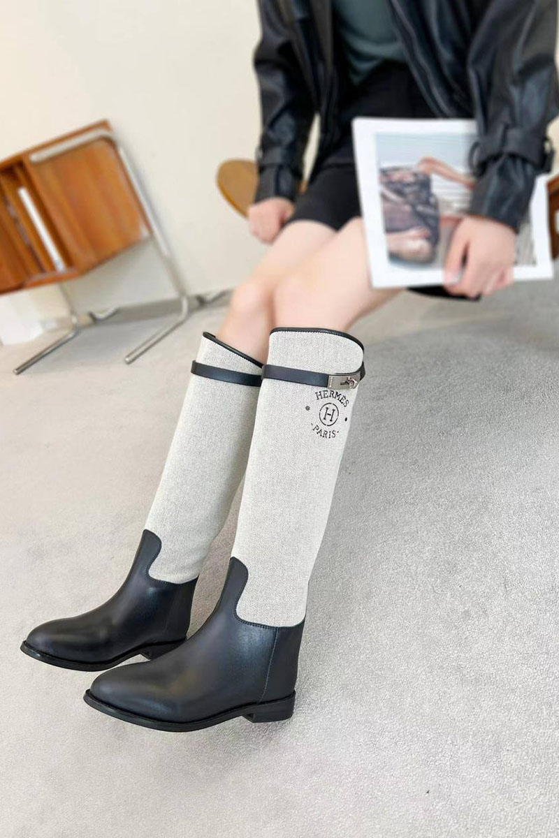 Женские кожаные сапоги Hermes Premium - Black / White