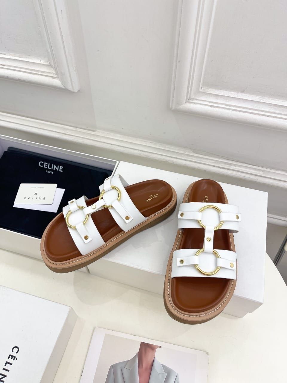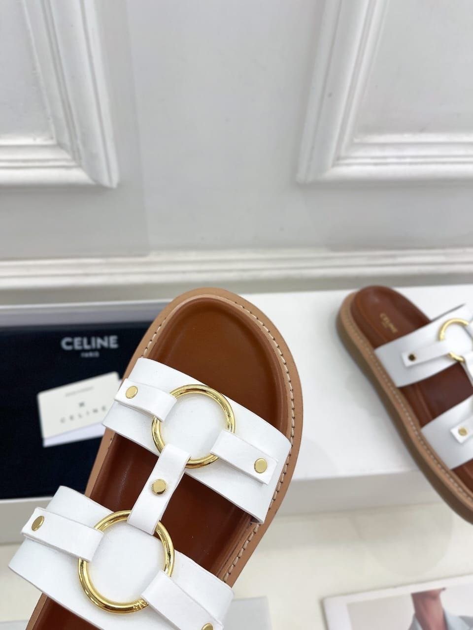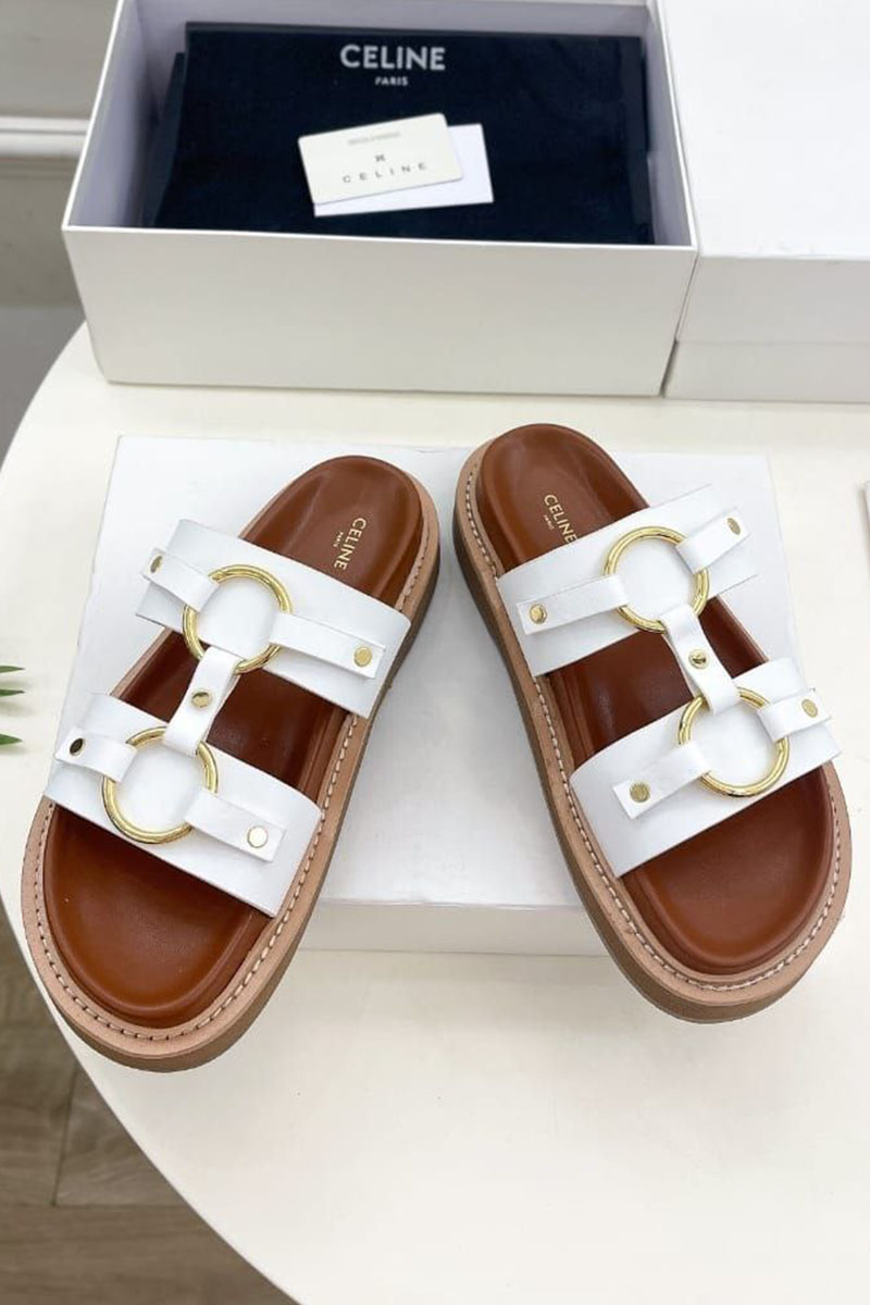 Женские кожаные шлёпанцы Celine Tippi - White