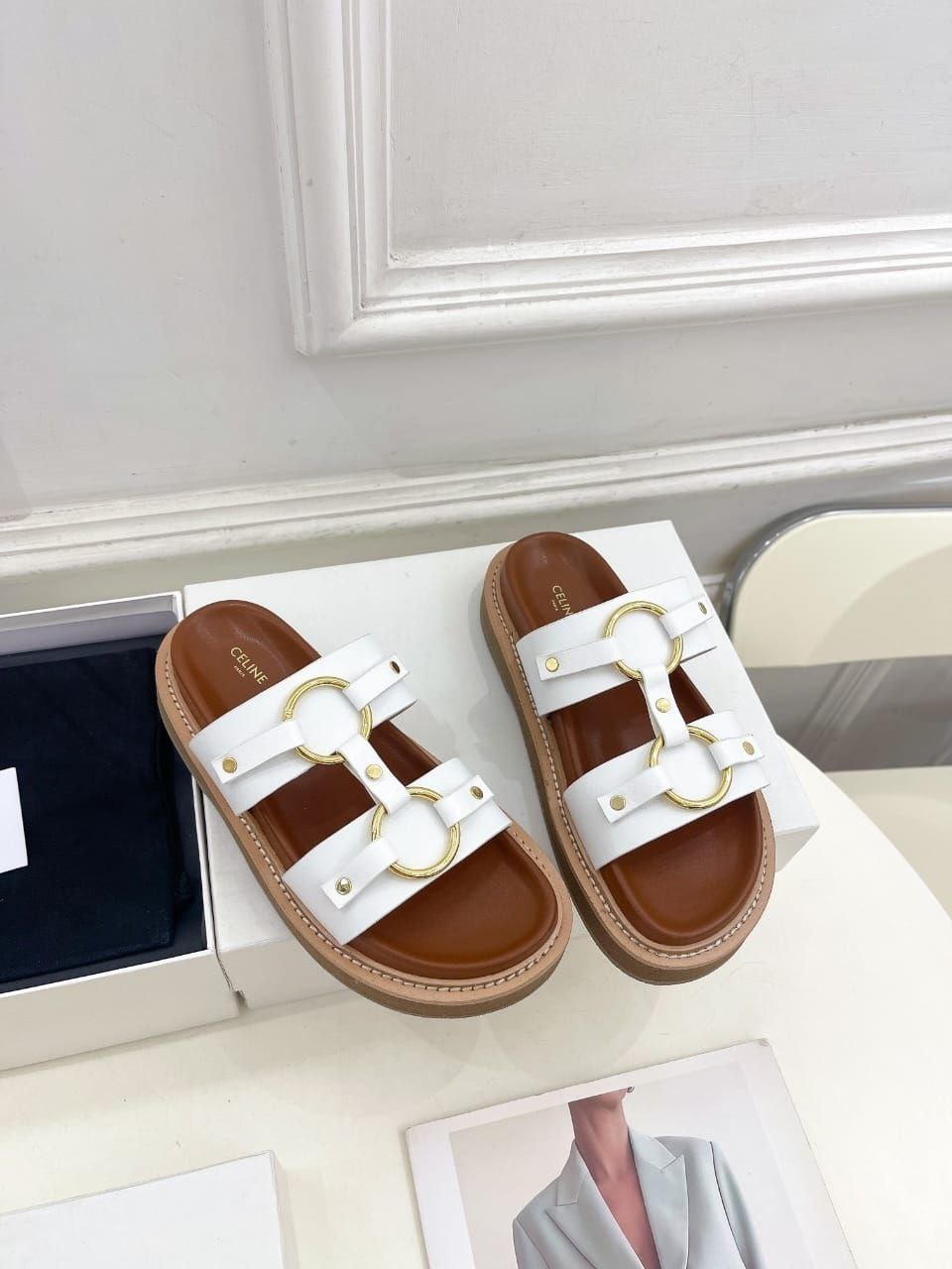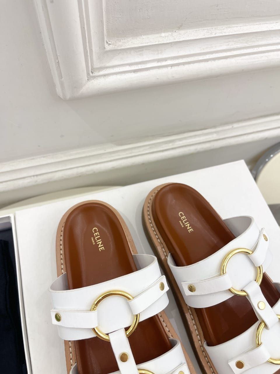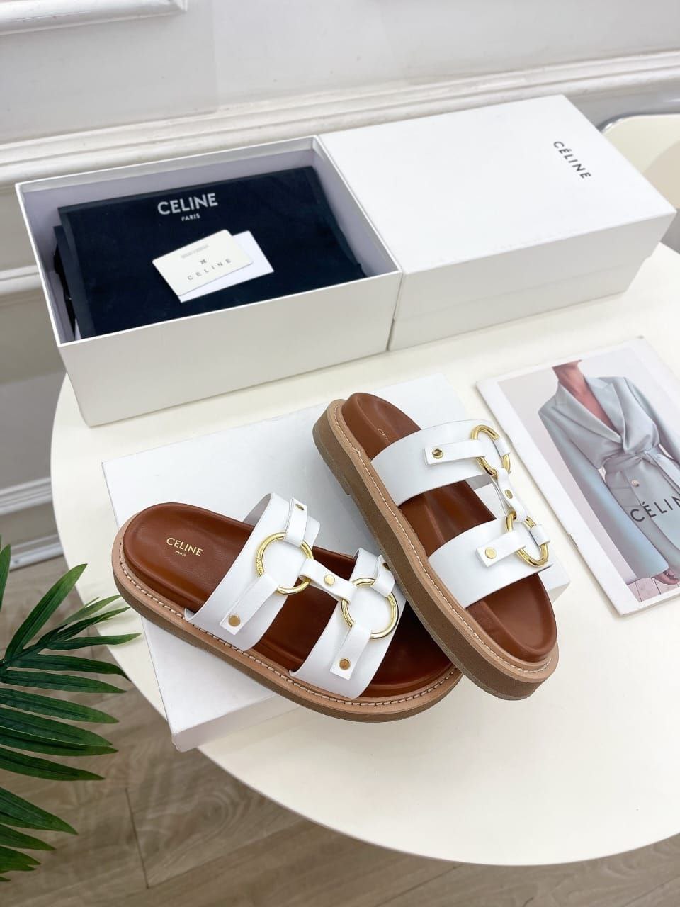Женские кожаные шлёпанцы Celine Tippi - White