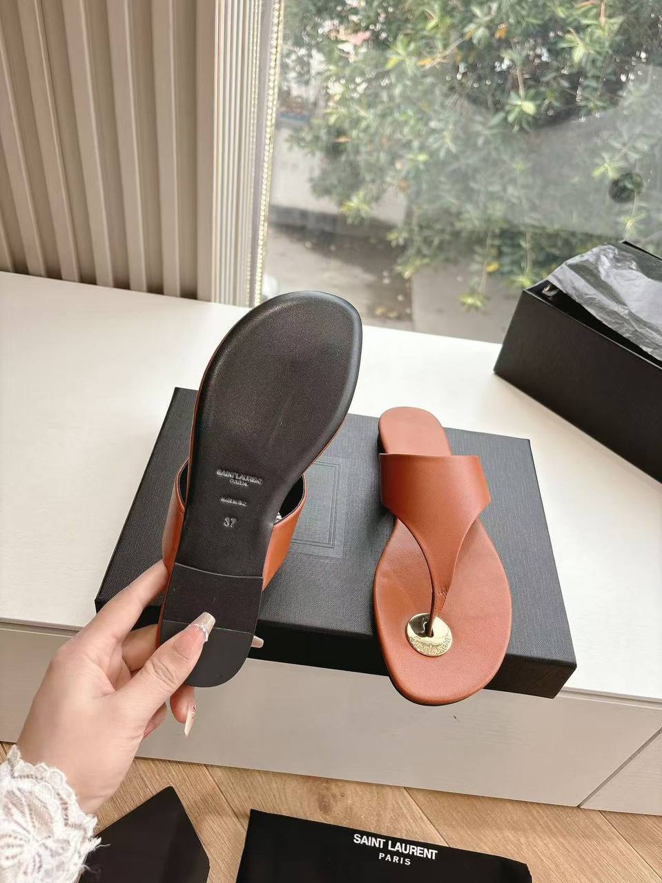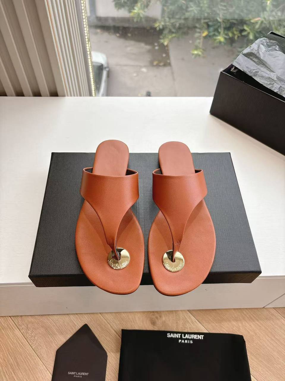 Женские кожаные шлёпанцы Yves Saint Laurent Premium - Brown