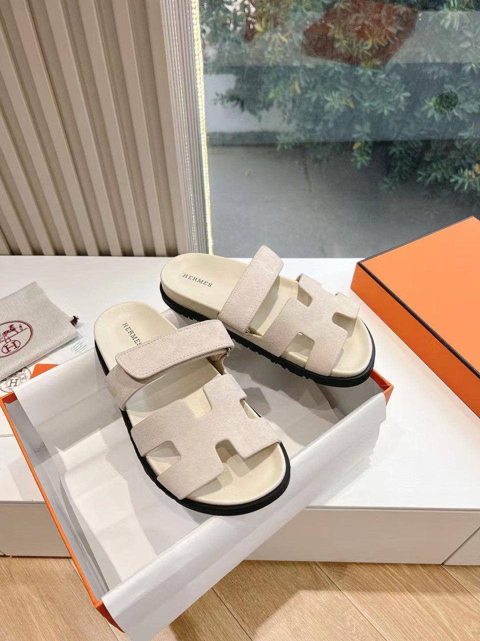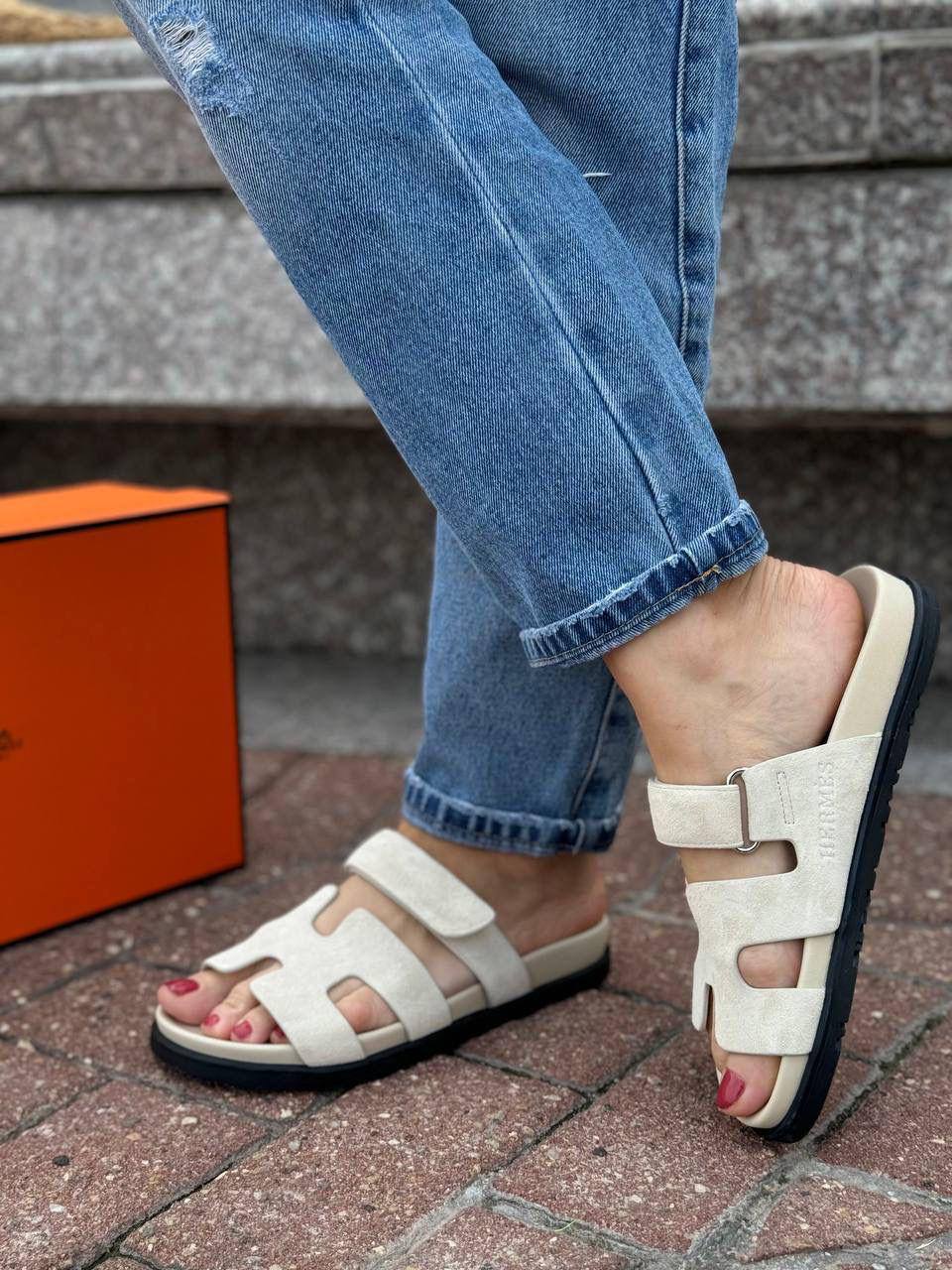 Женские замшевые сандалии Hermes Chypre - Beige / Black